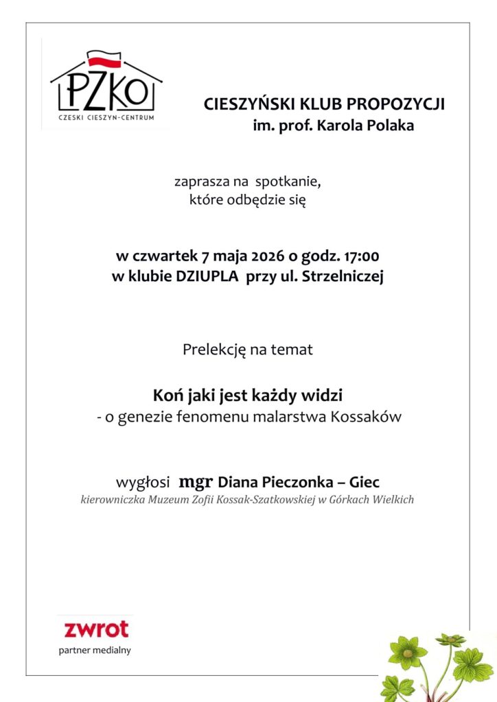 Cieszyński klub propozycji – Koń jaki jest każdy widzi7.5.2026 Mapa niedostępna Data 7.5.202617:00 Kategoria Wykłady i prelekcje